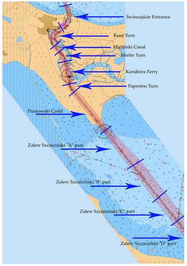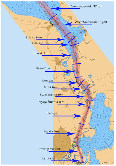This research covered the Świnoujście–Szczecin fairway channel, its navigation infrastructure, and the limitations to the bulk carrier parameters entering the port of Szczecin. The need to conduct such a research originated from the plans of the port infrastructure expansion and deepening of the waterway to a depth of 12.5 m. This study was conducted in 25 distinctive sections of Świnoujście–Szczecin (Table 1, Figure 2 and Figure 3).