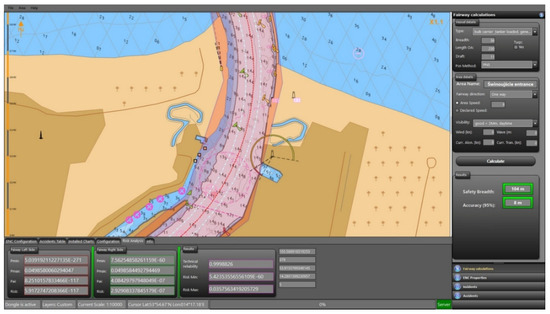 There has been significant progress within the last decades in the development of safety management and decision support systems [5,6]. In the 1980s, deterministic methods of designing the parameters of sea waterways were still dominant [7]; in the 1990s and the first decade of the 21st century, there was a development of probabilistic methods with the use of simulation tests [8]. The vessel technical error (VTE) was introduced by IMO in 2001 [9] and used in research [10]. The systematic approach to the waterway design has begun to be introduced nowadays [3] and was applied during the INSMS “NEPTUN” application development presented in this paper.