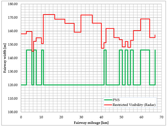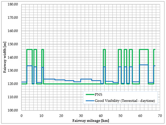 In Table 5 there is a list of the fairway widths of the safe manoeuvring areas for the “maximum vessel” at the seabed with a depth of 12.5 m for the current navigational markings at the confidence level (1 − α) = 0.95. Figure 7, Figure 8 and Figure 9 present the calculated widths of the fairway, so, in Figure 7, the fairway widths are estimated for restricted visibility (Vis < 2 NM) for two positioning systems, PNS and radar. As it is clearly visible in such a situation, the PNS system has an advantage over the positions taken by radar. In Figure 8, there are conditions with good visibility and, also, two positioning systems, but this time, instead of radar, the terrestrial method is used. In this case, using the PNS system is more favourable on the straight parts of the fairway, but on the turns, during perfect visibility, the terrestrial method gives better results. In Figure 9, night-time is taken into account, and the same positioning methods (PNS, terrestrial) as during good visibility and daytime were under consideration. As one could expect, using PNS gives the lowest fairway widths for a given vessel on the straight parts of the fairway. The terrestrial method again was better for the turns, but compared to the same method during the daytime, the widths are slightly bigger. Those calculations and results were to answer the question of whether it is possible to enter the port of Szczecin under the assumed conditions using various positioning systems and under which conditions the required widening of the fairway will be the smallest.
