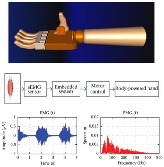 Active myoelectrically controlled hand prosthesis, generation of signals, and signals in the electromyography (EMG) [10].