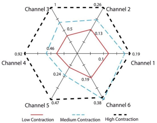 Furthermore, EMG-driven prosthesis performance is influenced by various factors, such as electrode position shifting, varying muscle contraction levels, forearm orientation, and limb position [16]. In addition, Khushaba et al. [16] investigated the combined effect of forearm orientation and muscle contraction levels on the generalizability of EMG pattern recognition. They first verified whether the subjects could produce EMG activity in all different classes of movement at three muscular contraction levels (low, medium, and high) by analyzing the RMS of EMG activity across all channels, orientations, and movements. Figure 3 shows the representative radar plot of the EMG signals RMS values collected from one subject performing wrist flexion (C4) when the wrist was fully pronated. The RMS values from the different channels were then grouped in separate columns for each force level, thereby constructing an RMS matrix. They found a significant difference (p = 0.003) between the means of the different force levels. They also mentioned that multiple factors can influence the accuracy of EMG pattern recognition.
