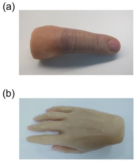 Rehabilitation of finger and hand defects using silicone prostheses: (a) finger prosthesis and (b) hand prosthesis.