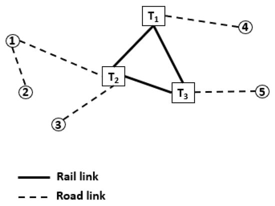 As in hub problems, the assumption that the induced graph by the located terminals must be a fully-connected graph (complete graph) is a restrictive constraint that may increase the total investment cost. Moreover, this restriction is non-realistic since, in real life cases, a rail–road network is usually incomplete due to the heavy cost incurred for the construction of its infrastructure. The current work relax this assumption and proposes a general model in which the located rail-road terminals are partially connected. Figure 2 shows a small incomplete intermodal terminal network. The induced graph by terminals is not incomplete. For instance, there is no rail link between rail terminals and .
