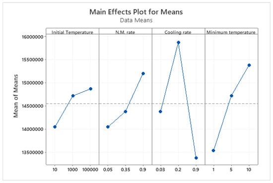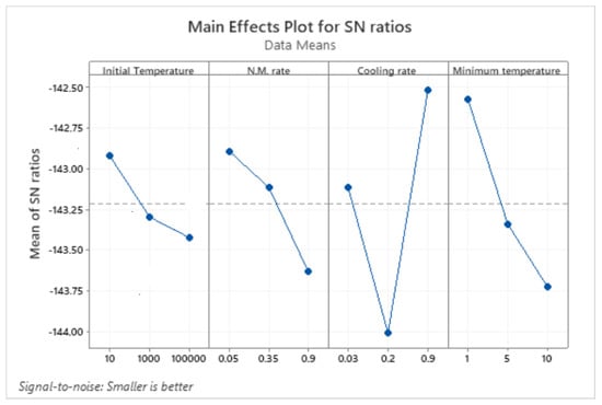 The Tagushi design of MINITAB software [53] was used for parameters tuning of the simulated annealing. Equation (12) defines the signal-to-noise ratio of Tagushi method. This ratio expresses the effect of parameters on the objective function. A maximum value of this ratio minimizes the effect of uncontrollable factors. This ratio is given by: