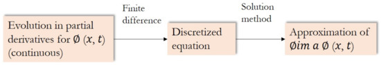 The approximations to the governing differential equation are obtained by replacing all the continuous derivatives with discrete formulas such as those in Equation (3). The relationship between the continuous (exact) solution and the discrete approximation is shown in Figure 2 [38]. The finite-difference model is a distinct step of translating the continuous problem to the discrete one. The finite difference formulas are first developed with the dependent variable Ø as a function of a single independent variable, x, i.e., . The resulting formulas are then used to approximate derivatives concerning any space or time.