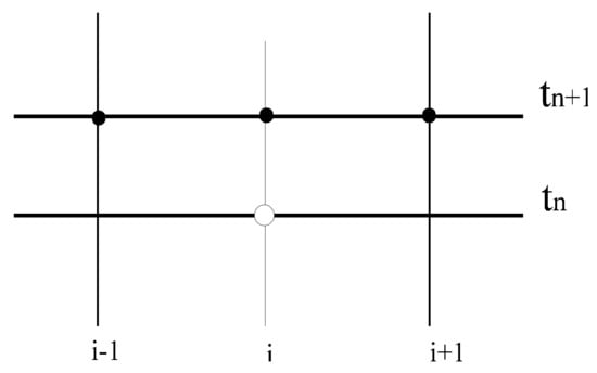 Truncation errors in this order-of-magnitude approximation Ο (Δt2) + Ο (Δx2). In contrast to Equation (14), with Equation (15) the fact that it is not possible to rearrange to obtain an algebraic formula for in terms of its neighbors , , y (or simply adding 1 to each spatial subscript in Equation (15)) shows that , depends on , and . Thus, Equation (15) is a system of equations for the values of Ø at the internal nodes of the spatial grid (i = 2, 3, ..., N − 1).