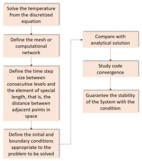 In engineering problems, it is common to find mathematical models that include partial differential equations [26,27,28,29]. The analytical solution provides a better understanding of the behavior of some phenomena since it can be determined at any instant of time. In general, it is not possible to determine this solution due to the non-linearity of the equations that constitute the mathematical model or due to the domain where the model is studied. Numerical methods in science and engineering provide a tool that allows translating mathematical models into computational procedures, whose results can be contrasted with the analytical solutions, in those cases where they exist. In the following, an algorithm for solving partial differential equations is shown, using the one-dimensional diffusion equation as a model problem. The choice of the same one is made based on its multiple applications in problems of mechanics using the finite difference method to determine the numerical solution of the diffusion equation using an explicit method and the implicit CN method [30,31].