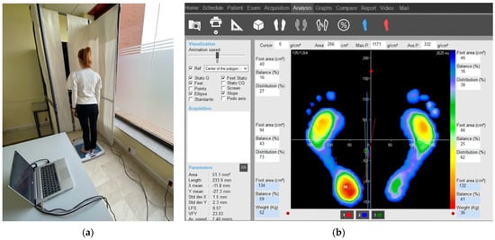 Participants stabilometric assessment: (a) environmental conditions and (b) software used for measuring balance outcomes.