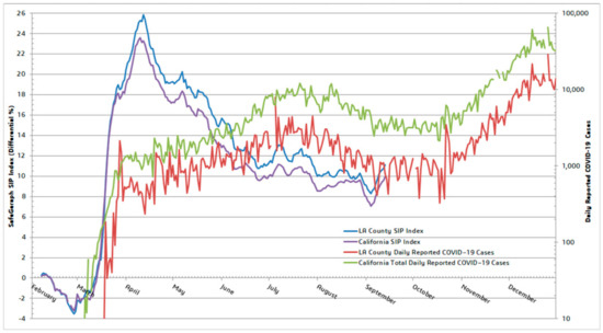 SIP response for the observed period peaked on 12 April [21,41], and decreased through late June. SIP response, measured as stay-at-home rate, is designated as no commuting or transit observed via mobile phone tracking. A pre-pandemic baseline rate of approximately 25% stay-at-home corresponds to a SIP index of 0. On 13 July commerce was restricted during the second case wave. Compared to the initial SIP response and despite the severity of the second wave (July through August), at nearly an order of magnitude higher than the first wave (mid-March through April), the population reaction was weaker, with less than a 5% increase in SIP response as compared to California and LA County at the pandemic onset, with a nearly a 15% decrease comparing the peak of COVID-19 case count during the second wave to that of the first wave. The magnitude increase of successive COVID-19 case peaks for each wave is so substantial that Figure 1 uses a y-axis logarithmic plot scaling to present this. Comparatively, SIP data is presented with a y-axis linear plot scaling. This smartphone based measure of SIP response over time closely resembles other indicators of stay-at-home behavior, such as keyword search histories for topics related to baking and home improvement, providing anecdotal evidence on activities performed by individuals with more available time and resources during the peak SIP period [42,43].