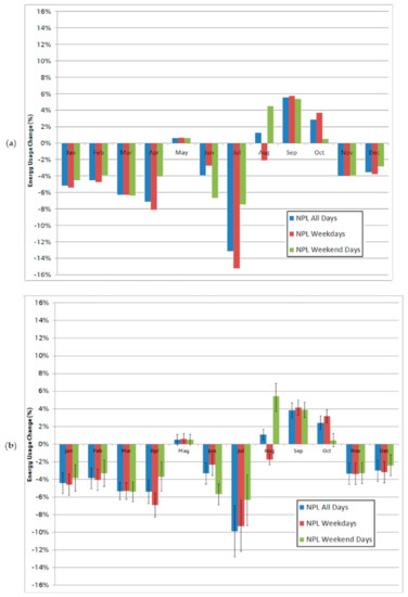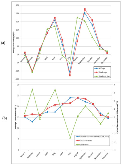 Temperature restriction is an approach used to filter values outside a pre-defined temperature range where limited correlation exists between temperature and elevated energy usage for each hourly temperature value. This method is appropriate when ambient temperatures largely remain near 18.3 °C (65 °F), which is the conventional degree-day calculation reference value customarily used by the US NWS. In the current analyses, a 4 °C range above and below the balance-point temperature was used for the restriction cut-off. Temperature-restricted 2020 evaluation period load data was compared to the combined 2018 and 2019 composite counterfactual model on a monthly or weekly basis considering day-type scope (all days, weekdays, or weekends/weekend days) or illustratively to a 2018 or 2019 single year baseline. Calculations of energy usage change were performed in the same manner as that used in the previously discussed temperature normalization process.