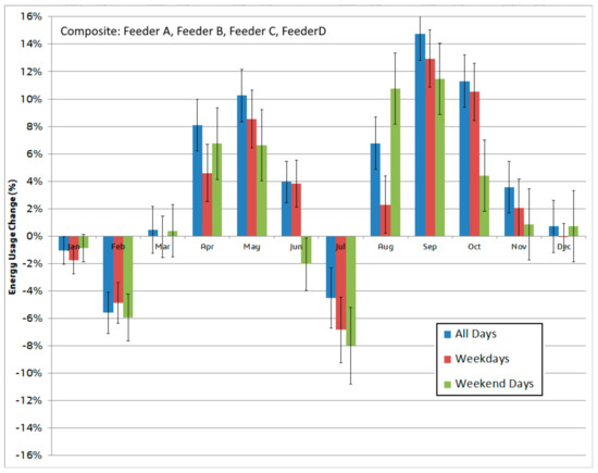 ECAM’s native engine was used to generate a predictive model of total load change for the entire pandemic period against a counterfactual model of the comparison period (Figure 5). Energy use change reported is consistent with the temperature normalization method and within 2% for all individual feeders across the evaluation period. Results show relatively constant non-temperature load for the COVID-19 pandemic period in 2020 compared to the counterfactual in the 1–5% range considering all days (weekends and weekdays) (see Figure 5).