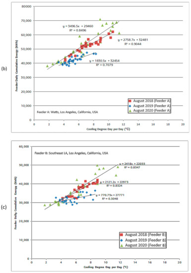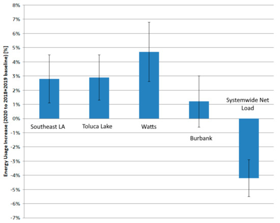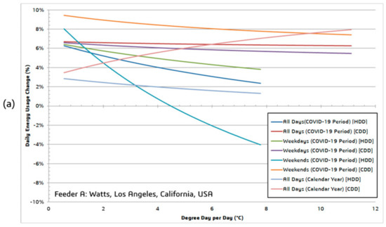 The current study analyzed energy use data from distribution station feeder loads, specific to defined geographic areas in the city of Los Angeles, accessed using generalized utility supervisor control data acquisition (SCADA). Such grouped load data is often the only measure available. Prior investigations have identified limitations in using it in standard linear regression-based energy prediction models due to autocorrelation and homoscedasticity. There are also limits when relying on temperature data at high time scale resolutions (e.g., per day), given the shifts in energy use corresponding to behavior variation over the course of the day. However, for certain use cases comparing daily average energy use to daily temperature data has been demonstrated to provide satisfactory estimation figures [27,28]. Here, the authors demonstrate an approach for analyzing grouped load data and daily temperature values to provide insight into how energy use changes due to widespread emergency conditions such as the COVID-19 pandemic.