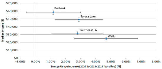 The current findings show limited evidence of a higher increase in non-temperature sensitive load over the COVID-19 period for lower income areas than higher income areas. The expected effect of SIP response on energy by income is not clear, as various factors predict mixed results. For instance, more highly educated, higher-income professionals were more likely to be able to shift to working from home, while less-educated workers were more likely to either continue working outside the home (e.g., in essential service or manufacturing) or lose their jobs. Lower-income households tend to have more members to use devices if everyone is at home, but higher-income households have more square footage and more devices to be used per person; furthermore, lower-income households spend less money (and time) on entertainment and dining outside the home than higher-income households normally, and would thus experience less change. Residential use of portable space heaters and window AC units, more common among older housing stock in lower-income areas, also adds to electricity use. Given the limited number of neighborhoods sampled here and the small observed effect, this result is considered questionable, but suggestive of further consideration; additional research would be required to clearly ascertain the income differences in effect of SIP response on energy use. However, it is worth noting that even the same or lower increase in energy use is a greater hardship for lower-income households, as they already experience a significantly higher energy burden (that is, the proportion of their income spent on energy bills) and have little or no discretionary income to cover unexpected expenses.
