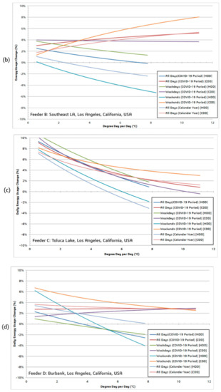Load impact from non-temperature-sensitive loads during the early pandemic were estimated from sampled feeders through both temperature restriction (Table 4) and temperature normalization (Figure 4) resulting in estimated increases of 5.3% and 5.7%, respectively (mid-Mar through April, all days), less than that reported by Pecan Street. With the exception of Feeder C, change in weekday load was more impacted than weekend load compared to the 2018–2019 baseline during the early pandemic (Table 4). Non-temperature loads were a substantial component of energy used which is evidenced by the similarity in total load change (Table 3) to temperature restricted load change (Table 4). Heavy mixtures of both HDD and CDD during this period complicate regression analyses (of the type used in Figure 7). This is because the nature of the degree day metric is not exclusive to heating or cooling, but is the balance point difference computed between the range from daily highs and lows. When temperature fluctuates enough over a 24-h period to require both heating and cooling, that day may be labeled with a low value for HDD, CDD, or both. This effectively skews energy use per HDD or CDD when using multiple regression models. Temperature normalization based on average daily temperature regression performs marginally better with respect to these temperature variations.