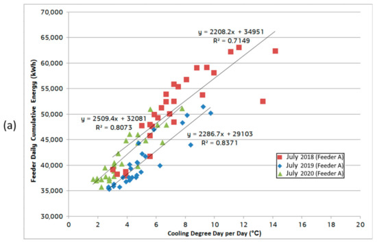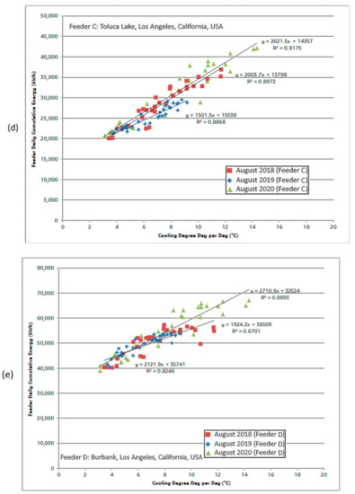 Comparison of feeder daily energy use for 2018, 2019, and 2020 for observed CDDs for (a) the month of July for Feeder A; and (b–e) presenting the month of August for Feeders A–D.