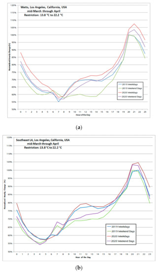 With a diverse population and a warm, dry climate and typically temperate spring, Los Angeles provides a near-ideal environment to assess the impact of the pandemic on residential utility customers, especially assessing non-temperature sensitive load contribution to total residential energy use. In addition, the city of Los Angeles provides a useful case study because it was substantially impacted by the COVID-19 pandemic in both number of COVID-19 cases in addition to state and local restrictions on business, services, and travel. California’s aggressive stay-at-home order was initiated on 19 March and was followed by a relaxation in June, a partial reinstatement in July (following the start of a second wave of COVID-19 cases), a relaxation in September and an amended limited stay at home order issued in late November following through the end of the year (in response to a third wave of COVID-19 cases). Los Angeles County (the major regional health reporting resource covering the city of Los Angeles) suffered three successively increasing waves of COVID-19 case peaks in 2020, occurring on 8 April, 22 July, and 27 December with this one county representing 32% of all cases statewide (note that approximately 25.5% of California’s population lives in Los Angeles County) [29,30]. As of 31 December, 7.7% of the LA county population had been infected with COVID-19. The city of Los Angeles regularly maintained stricter controls on business activities to reduce population movement compared to both state and county COVID-19 guidelines [30,31]. A follow-up SIP order to the one issued in spring focused on Los Angeles, beginning 30 November and continuing through 31 December, this was the strictest order in the state of California, effectively banning most outdoor gatherings, restricting employment travel, and reducing retail capacity. Accordingly, the city of Los Angeles provides a rich opportunity to draw transferrable lessons on energy responses to major behavioral shifts.