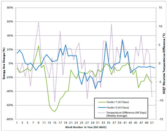 Direct change in energy use (non-normalized for temperature) for Feeder E (large apartment complex) and Feeder F (commercial building).