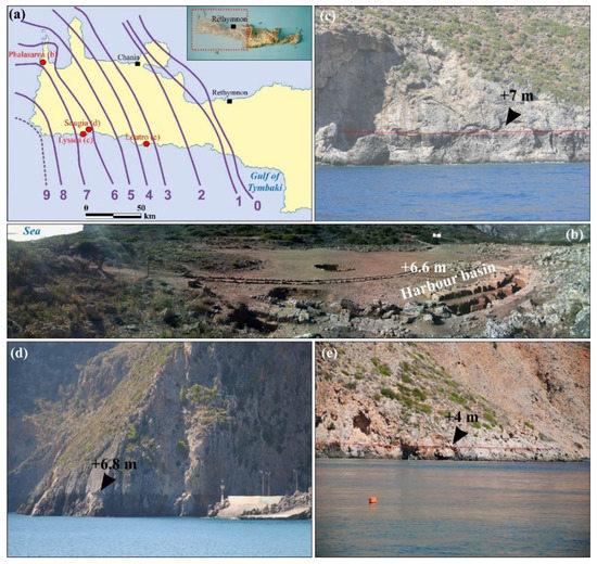 Different views of the 365 CE coseismic bioerosional notch. This notch is related to a regional uplift of the westernmost part of Crete and can be observed at different elevations above present-day sea level (a). Purple lines in (a) are isobases marking the uplift. Archaeological implications are important since various sites (mostly harbour basins) were landlocked: at Phalarsana (b), Lyssos (c), Sougia (d) and Loutro (e).