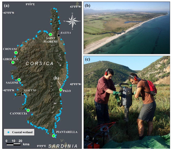 Corsica is the fourth largest Mediterranean island and counts approximately two hundred coastal wetlands (Figure 2a,b), which mainly formed during the last six millennia due to the post-glacial sea level rise slowdown [73,74]. Some of these formed due to the deltaic progradation of the main rivers of the island, while others were the result of a combination of particular coastal configuration and Holocene spatial redistribution of sediments by the sea parallel to the palaeoshore (isolation of marine to brackish waters behind a natural barrier). Being subaqueous, wetland sediments do not form soils and do not directly support archaeological sites, although they may incorporate archaeological materials [6]. Their importance lies more in their centrality for palaeoenvironmental reconstructions and in the fact that they are influenced by both marine and terrestrial dynamics of sedimentation, thus necessitating a multiproxy approach. The range of techniques that can potentially be applied to geoarchaeological goals is derived from related disciplines. However, the purpose of geoarchaeology is to select those procedures that will yield the results that are the most adapted to the accurate evaluation of a particular palaeoenvironmental context [7] within the constraints of available financial and human resources.
