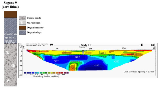 Core lithology and Electric Resistivity Tomography profile (a). The investigation depth is about 20 m, and the core Sagone 9 is situated in the middle part of the profile, enabling us to relate the electrical signal to the granulometry. A first geoelectric unit (GE1, Figure 3a), which is found between the surface and ca. 2.5 m below mean sea level (bmsl), exhibits generally intermediate resistivity values (20–200 Ωm). The stratigraphy of core Sagone 9 indicates the presence of marine coarse sands from ca. 1 to 3 m below sea level (from 2 to ca. 4 m below the surface). Superficial high resistivities (>400 Ωm) at the western edge (GE1a, Figure 3a) are attributable to the granitic bedrock associated with coarse-grained material (footslope deposits). The easternmost part of the first geoelectric unit (GE1b, Figure 3a) reveals an increase of the signal (locally >200 Ω·m) in two horizontal layers: the first at the surface and the second at ca. 3 m bmsl. The second geoelectric unit (GE2, Figure 3a) shows very low values (<10 Ω·m) and is found below unit GE1, around 5 m in depth. It consists of sands, and it is noteworthy that the top of Unit GE2 corresponds to the upper limit of the aquifer, which contains haline particles. The third geoelectric unit (GE3, Figure 3a) is at a depth of 12 m below the surface (10 m below present-day sea level), just west of the midpoint of the SAG01 ERT profile and could be interpreted as a part of the granitic bedrock.