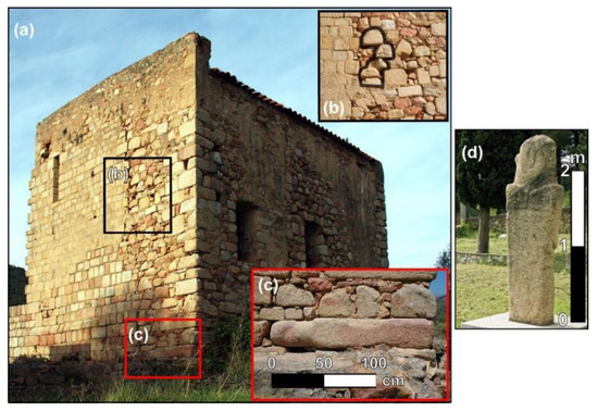 In the Lower Sagone Valley (SW Corsica), a large deltaic plain formed over the last three millennia [97], even if the present-day landscape configuration indicates no coastal wetlands (lagoons or ponds). Archaeological studies have identified numerous anthropomorphic menhir statues on the west bank of the Sagone River [102], some of which were reused in medieval structures (Figure 4a–c) or otherwise removed from their original location (Figure 4d).