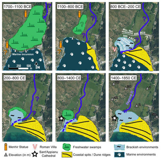 Palaeoenvironmental research conducted in the mid-2010s [97] was based on coring evidence. A mechanism of rapid deltaic progradation starting ca. 800 cal. BCE was revealed and was probably partly caused by the 2.8 ka BP ongoing climatic deterioration, which provoked the initial large-scale phase of deltaic progradation of large rivers situated on the north Tyrrhenian coast [103,104,105]. Surprisingly, the coring results also indicate the existence of a freshwater environment on the west bank of the present-day river bed where the menhir statues were discovered (Figure 5). The base of this freshwater environment has not yet been reached (it dates at least from the beginning of the Middle Bronze Age, ca. 1700 cal. BCE), but a clear transition from a coastal freshwater wetland to a marine environment has been dated at ca. 1100 cal. BCE (Figure 5 [97]). The complete palaeogeographic reconstruction of the Sagone deltaic plain first aimed to better understand the landscape evolution and then to precisely evaluate changing environmental conditions from the beginning of the Middle Bronze Age (MBA) until modern times (Figure 5), with a specific focus on the supposed period of appearance of the menhir statues during the Late (LBA) or Final Bronze Age (FBA).