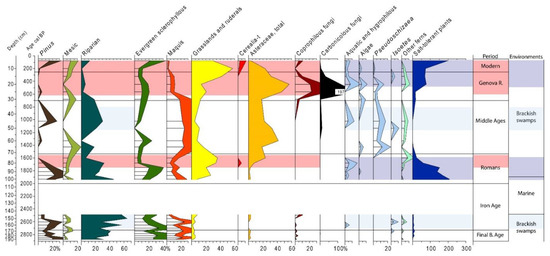 Synthetic pollen diagram established for the Palo pond sequence [61]. A period of cereal cultivation is dated to Late Roman times and also corresponds to an increase of ruderal plants and to a decrease in the arboreal taxa. Note the high representation of coprophilous fungi, suggesting intense pastoral activities during the Late Middle Ages and under the administration of the Genoese Republic.