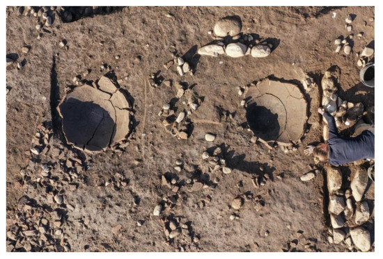 This information is in good agreement with archaeological and historical evidence derived from the occupation of the nearby Covasina castle. However, the idea of a possible human presence during the Iron Age is a novel feature. The most interesting finding was the discovery of crop cultivation during Late Roman times in the northern part of the Palo pond, where archaeological material was discovered a short distance (about 1 km) away to the NW. Very recently, in 2020, archaeological surveys were conducted at the Chiarata site (situated 3 km to the NW of the coring site), and the associated excavations revealed the presence of buildings made of rounded cobbles and the bases of two earthenware dolia (Figure 8), which have been dated to Mid-to Late Roman times. This discovery suggests the storage of goods associated with agriculture. On this point, archaeological findings confirm palynological results.