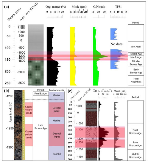 However, little attention has been paid to the Western Mediterranean and, in particular, to the insular environments. Over the last few years, important research (part of the CNRS research programme MISTRALS) has been conducted in the coastal wetlands of Corsica to attempt to identify specific sedimentary signatures and societal responses to these climate events. On the western coast of the island, the coastal ponds of Canniccia, Girolata and Crovani (Figure 2a) have been the focus of attention, and evidence of high detrital input has been recorded by reconstructing their sedimentary history. All these sites confirm that around 1350–1100 cal. BCE (Figure 9a–c), a phase of thick deposition of terrestrial sediments occurred due to increased runoff which reinforced the alluvial/colluvial activity. For approximately two and a half centuries, intense wet conditions (episodes) were observed in Corsica, while during the same period (300 years) in the Eastern Mediterranean, a contrasting arid phase is evidenced [30,118]. All the palaeoenvironmental records derived from borehole sequences obtained in western Corsica suggest a phase of important detritism on the western coast around the 3.2 ka BP RCC event. It is noteworthy that, in southern France, similar terrestrial input has been observed in the Rhone valley [119] and in the northern Pyrenees [120]. This appears to confirm that an “abrupt” regional climate change affecting the Western Mediterranean can be identified and linked to the strengthening of sediment accumulation in river valleys and coastal ponds. The climate mechanisms of this strong terrestrial input remain largely unknown. Nonetheless, the societal responses to these natural phenomena must be taken into consideration, rather than systematically assuming a non-resilience to the changing environmental conditions.