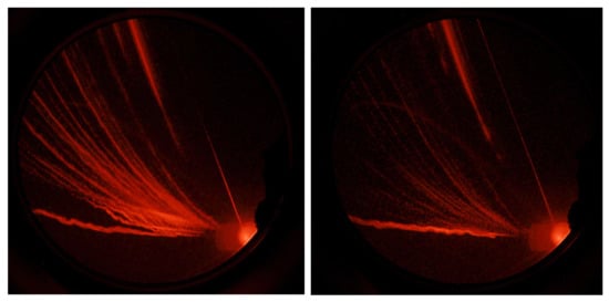 The spectrometer used a microchannel plate coupled to a phosphor screen and to the CCD. The strength of the TP’s magnetic field was increased up to 0.12 T. A potential difference of 2.9 kV was applied across the 21.5 mm wide gap between the spectrometer electrical plates in order to reach a separation of the ion tracks on the spectrometer’s detection system. The parabolic tracks on the image plane (within Cartesian coordinate system and under nonrelativistic approximation) are described by the following Equation [9]: