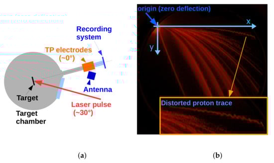 Figure 2 also shows a typical TP snapshot with the Cartesian coordinate system, where the parabolic track corresponding to protons is distorted due to EMP interference. While the protons were detected by the TP, the EMP generated in the target chamber and propagated outside from it was simultaneously recorded by a plane antenna positioned directly on the TP electrodes, as can be seen in Figure 2.