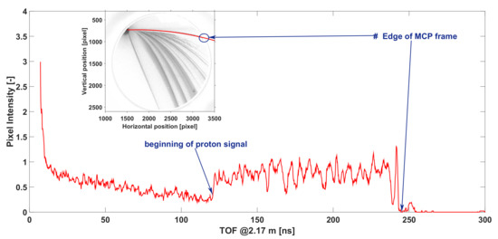 where x stands for the distance between the origin of the parabolic track and the actual position of an ion in the detector plane due to its deflection in the magnetic field. By knowing the distance between target and recording system, the corresponding proton time of flight (TOF) was calculated. Therefore, the dependence of the pixel intensity (along the parabolic curve) on the TOF of protons was derived for each point of the parabolic track as can be seen in Figure 3. This calculation shows which part of the EMP signal influenced the TP, because the antenna (recording the EMP signal) was positioned directly on the TP electrodes. As Figure 3 shows, the signal recorded by the antenna between 0 and 243 ns (the edge of the detector) corresponds to the entire parabolic track of protons from zero-deflection point up to the edge of MCP. Since the proton signal occurred only between 120 and 243 ns in this particular measurement, only the part of the EMP signal between 120 and 243 ns was considered in further processing. This part of the signal is highlighted with red in Figure 4, showing the measured antenna signal. The EMP that affected the TP before the fastest protons (in our case, before 120 ns) can also be included in analysis. This would basically also predict the distortion of the parabolic track in the region where no protons were detected in this experiment. Nevertheless, analysis was mainly focused on the region between 120 and 243 ns because the results could be compared with the measured parabolic track of protons.