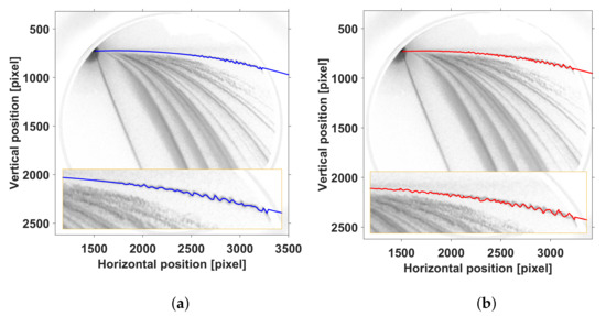 where is the electric field applied to the electrodes, and K is the constant that may be changed in order to amplify the influence of modulation. This constant was less important, since we only investigated the similarities of the frequency. Resulting electric field was no longer constant and led to the distortion of parabolic tracks on the recording system. In particular, the electric field (3) was substituted in Equation (1), which is plotted in the TP snapshot. Additionally, the captured track of protons was extracted from the snapshot by finding the maximum of intensity in a neighborhood of the parabolic track of protons. Eventually, both the extracted parabolic and the modulate track could be plotted. Both curves are shown in Figure 5 with the TP snapshot converted into grayscale in the Cartesian coordinate system.