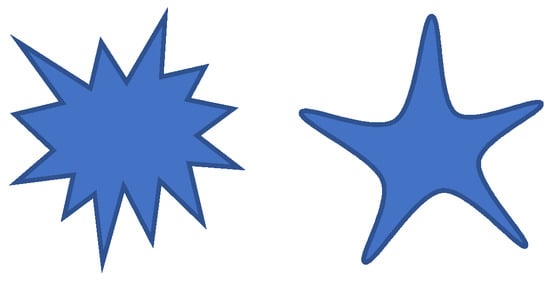 When it comes to shape and smell, the effect that a wine’s glass shape seems to have on the perceived flavor intensity point toward a multisensory scope, for example, via the bouba-kiki effect (also sometimes referred as the maluma/takete effect). Such effect originally suggested the existence of specific associations between sound and the visual shape properties [38]. Here, it is argued that most people tend to prompt a strong preference to pair jagged/angular shapes with “kiki/takete” sounds, and rounded shapes with more “bouba/baluba” types of sounds (see Figure 1).