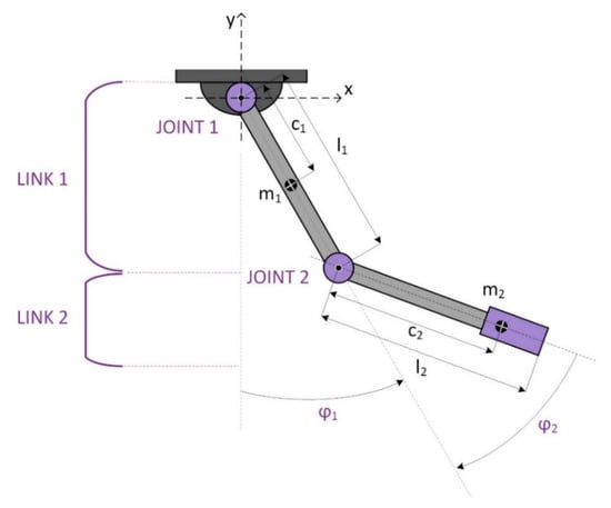Lagrange’s equations were used to derivate a dynamic model of the described system, which has two degrees of freedom [29]. The general formulation for a robot with 2 degrees of freedom is given in Equation (1), where L is Lagrangian, φi is joint positions, derivation of the joint position is joint velocities, and τi is force term.
