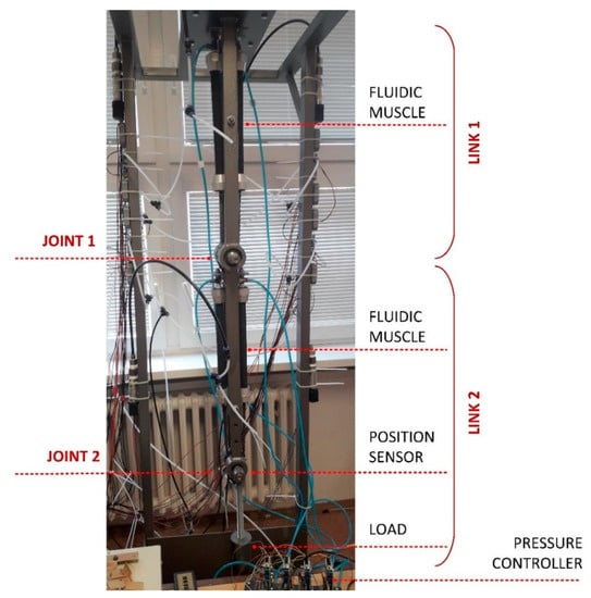 The object of the research was a planar robotic arm of the manipulator, which is driven by an unconventional type of actuators (pneumatic artificial muscles) and has two degrees of freedom. The manipulator is shown in Figure 2. The construction of the manipulator consists of metal profiles, which ensure the stability of the manipulator and the attachment of the upper arm of the manipulator to the upper base of the structure. A load weighing 3.34 kg is attached to the other arm of the manipulator. The type of pneumatic drive was chosen for the manipulator drive-fluid muscles from the manufacturer FESTO. If these muscles are pressurized, their activation occurs, as a muscle contraction, which causes the translational tensile force of the muscle. However, since the muscles within the manipulator are antagonistically involved, and also the chain-sprocket and joint subsystems are present within the system, the resulting movement is rotational (the subsystems ensure the transmission of torque). During the research, the angle of rotation of the joint was monitored as an output parameter. An incremental sensor was installed in the manipulator to be able to read this parameter. To achieve the required outputs with the manipulator, the pressure in the muscles must be regulated—electronic pressure regulators (one for each muscle) are used for this. In addition to the possibility of pressure coordination, the regulators contain built-in pressure sensors. An AMD Athlon X2 computer with a 5 GB RAM processor was used as a control unit to control the manipulator. The software support of the stand consisted of the use of the Matlab and Matlab Simulink programs, while the control signals were operated with a Humusoft MF624 card.