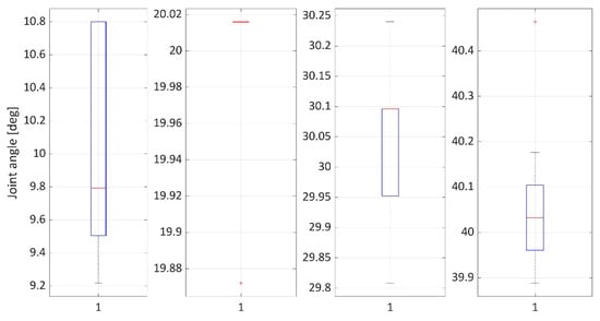 Figure 3 shows 4 boxplots (when viewed from left to right for an initial joint angle of 10°–40°), which show how the initial values of the joint angle have changed in 4 different measurement cases. Each boxplot was processed based on the measured initial joint angles in 20 measurements. It can be seen from the graphs that the mean of the 20 measured initial values (red line) approaches the required input at most in the case of an angle of 20° (the second graph from the left with mean value 20.016°), where it is not possible to see the 25th and 75th percentiles (blue rectangle) is present. Only one different value is also a remote value of 19.872° (shown in the second graph on the left by a red cross). It is possible also to observe a remote measured value of 40.464° in the fourth graph from the left when the initial angle was set to the reference value of 40°. The largest difference between the minimum and maximum set input value (black horizontal line) can be observed for an initial joint angle of 10° (first graph from the left).