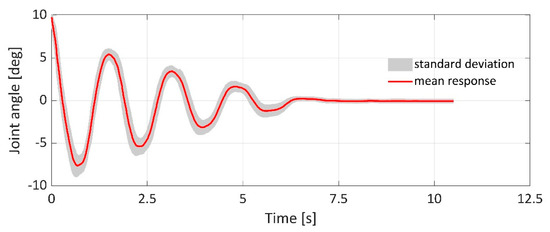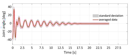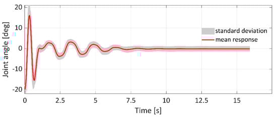 While for link 1, the initial angles were set in the range of up to 1°, the setting of the initial joint angle for the measurements of link 2 was more difficult in terms of constraints in the construction of the system. Figure 9 graphically presents the mean response (red curve) and standard deviation (grey area) when the initial angle was set to −10°. The total interval of the initial values of the angle of rotation was <−7.92°; −10.08°>, the Mode from the twenty initially set angles was −8.928°.