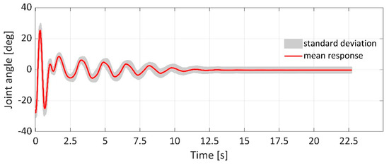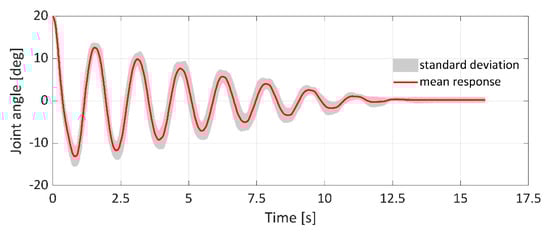 The interval for the reference value −30° for link 2 was <−23.904°; −31.248°>, where from the range of initial values, it is possible to monitor a more significant value of the parameter Mode (−24.048°) in comparison with the reference value. The shift of the beginning of the mean response curve (Figure 11) and the standard deviation area itself is caused by one of the measurements when the initially set value was −23.904 °.