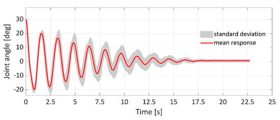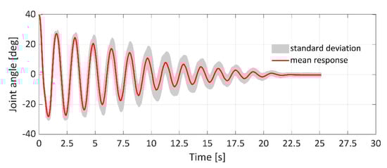 From the 20 measured time courses of the joint angle, where the initial joint angle is 10°, the angles were set for individual measurements in the interval <9.216°; 10.08°>. The maximum value of the interval represents the statistic parameter Mode. Figure 4 represents the mean response (red curve) and standard deviation (the grey area) from measured data.
