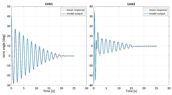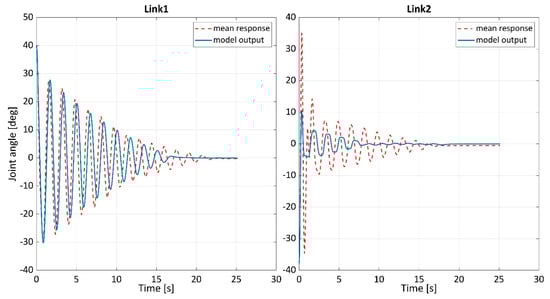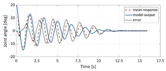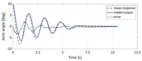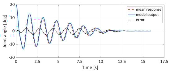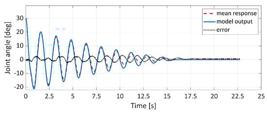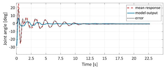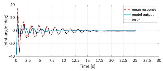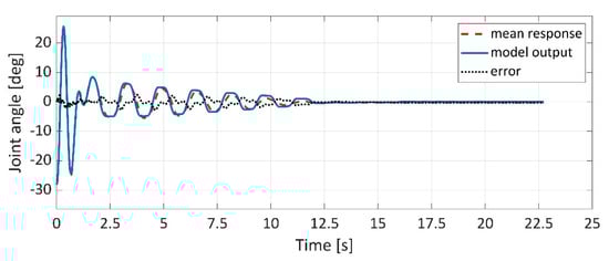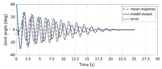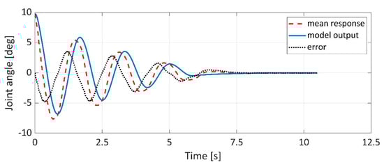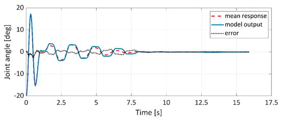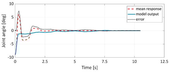 Figure 13, Figure 14, Figure 15 and Figure 16 show the model outputs for the joint 10°–40° for link 1. It can be seen from the waveforms that the model outputs (blue solid line) are largely unable to simulate an expected output represent by mean responses (red dashed line) at the specified input parameters. The error (black dotted line) for a joint angle of 10° has a decreasing tendency with a gradual approach to zero (Figure 13). The error waveforms for the joint angles 20–40° (Figure 14, Figure 15 and Figure 16) are initially smaller but then increase over time, and at the moment when the mean response and thus the output model approaches zero, the value of the error is minimized.