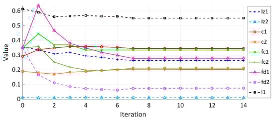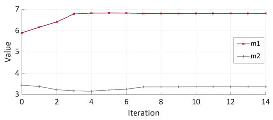 The parameters that were the subject of estimation and used for the subsequent optimization of the model were estimated in the Parameter Estimator. During the estimation process, this tool (among other things) offers the possibility to monitor how the values of the parameters are estimated (changed) depending on the iterations until all the values of the estimated parameters are stabilized. The result of this phase from the given toolbox can be seen in Figure 31 and Figure 32. During the estimation, only one graph could be viewed, where the waveforms of all 11 estimated parameters were. However, since the masses m1 and m2 are represented by much higher values than the remaining parameters, the mass curves were exported to the second graph for better clarity. Based on the waveforms of Figure 32, it can be seen that the smallest changes in the parameter estimation occurred in the parameters c2 (Distance to the center of mass for link 2) and Iz2 (Moment of inertia for link 2). On the contrary, significant changes took place in the values of Coulomb friction magnitude fd1, fd2. In Figure 31, it is possible to observe how the weight estimate has changed. From the course of estimating the mass m2, it can be seen how the weight changed in the first iterations, but the result of the estimation in the last iteration was, in the end, very similar to the original value.