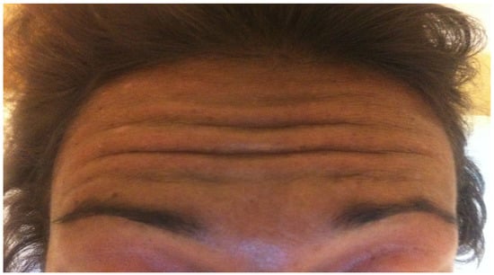 Case 2. A 33-year-old woman before the injections of BoNTA reconstituted with lidocaine for the treatment of forehead wrinkles.