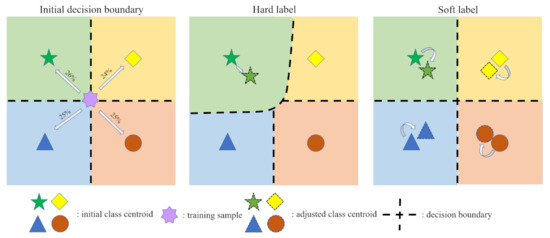 For our method, we propose fuzzy pseudo labels which employ a probability matrix to update the classifier. In Figure 1, we give a graphical illustration to explain how soft label works. The class centroids are calculated by labeled source samples and the decision boundary can be obtained by means of the distance to each centroid. For an unreliable training sample which located in the intersection of decision boundary (also can be described as it has similar distance to each centroid), the probabilities of it belonging to any category is extremely close, e.g., 24%, 25%, 26%. In such situation, assigning the label with biggest probability is risky. Like the figure in the middle shows, the updated centroid would have a big influence to decision boundaries. When we adopt soft labels, the case is shown in the last figure, each centroid would move a distance to the training sample according to corresponding probability value. Intuitively, soft labels have significant less effect on decision boundaries than hard.