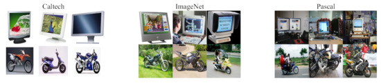 ImageCLEF https://www.imageclef.org/2014/adaptation (accessed on 14 May 2021). ImageCLEF is an online DA competition, which contains three domains: Caltech256 (C) [19], ImageNet (I) [20] and PASCAL (P) [21]. There are twelve kinds of objects, and fifty images of each object. Some pictures can be found in Figure 2. In our experiments, we adopt the ResNet50 (input dimension ) features of images, and six tasks, e.g., , are constructed.