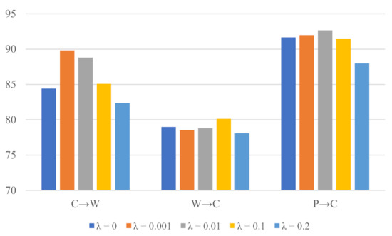 For our method, there is one hyper-parameter to be adjusted, indicates the weight of fuzzy graph learning. We run FGLSF varying with values of parameter which are sampled from {0, 0.001, 0.01, 0.1, 0.2} on three tasks, e.g., , and . If is too small, the model would fail to align distributions of two domains. And as it getting larger, the problem of representation shrinkage is emerging. The experimental results shown on Figure 3 are consistent with the analysis, the accuracy first rises and then falls as gets bigger.