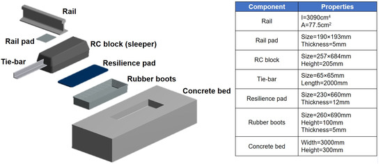The ANSYS Ver 17.2 [] software package was used to conduct the 3D finite element (FE) analysis in this study by employing solid elements. The lower part of the concrete bed was fixed under supported conditions; the vertical load was considered as the displacement condition (5–40 mm). The edges of both ends of the lower part of the concrete bed were fixed. Further, both ends of the lower rail edges were fixed. The boundary condition of the rail support was applied with a roller condition. The load conditions were applied in the vertical and horizontal rail directions. The mesh of the track model contained 888,564 nodes and 437,264 elements. The FE model of the booted sleeper track was configured using the parameters shown in Figure 4. The solid components of the STEDEF system evaluated in this study included the rail, rail pad, RC sleeper, resilience pad, rubber boots, tie-bar, and concrete bed. The mechanical properties of these components are listed in Table 1.