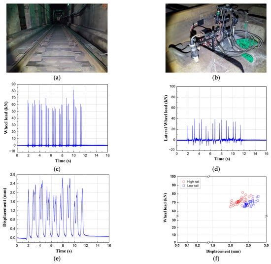 Field test setup and examples of collected data: (a) view of the test area; (b) measurement setup; (c) example of the measured dynamic wheel load; (d) example of the measured lateral wheel load; (e) example of the measured RC sleeper vertical displacement; (f) distribution of wheel load and RC sleeper displacement measurements.