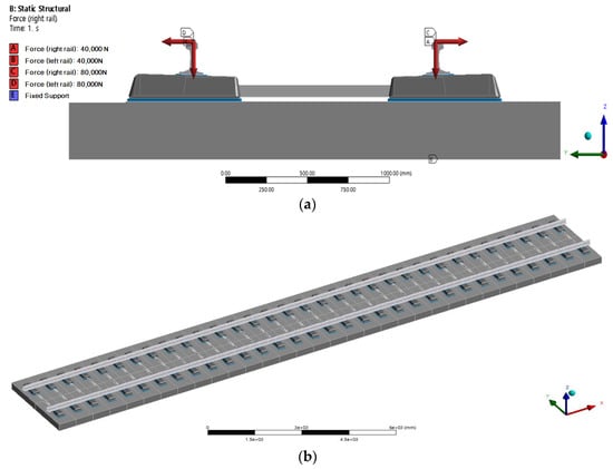 FE model of the booted sleeper track system: (a) load and boundary conditions for model verification; (b) full model for substructure displacement analysis.