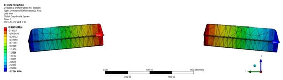 The dynamic and lateral wheel loads from the field measurements (i.e., 80 kN and 40 kN, respectively) were applied to the rails in the model shown in Figure 4a as the load conditions for verification of the FE model of the track system. The accuracy of the model was then confirmed by comparing the RC sleeper vertical displacement obtained from the field measurements with the RC sleeper displacement obtained from the FE analysis. Figure 5 shows the FE analysis results for the vertical displacement of the RC sleeper.